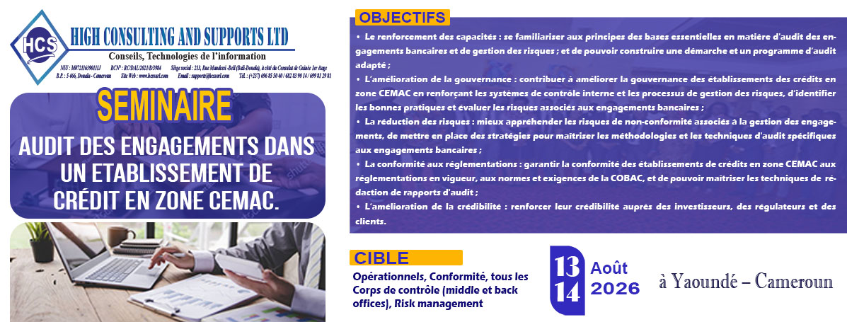 Nous contribuons au renforcement des compétences des établissements de crédits, financiers, micro finance et entreprises industrielles et commerciales de la sous régions Afrique Centrale.